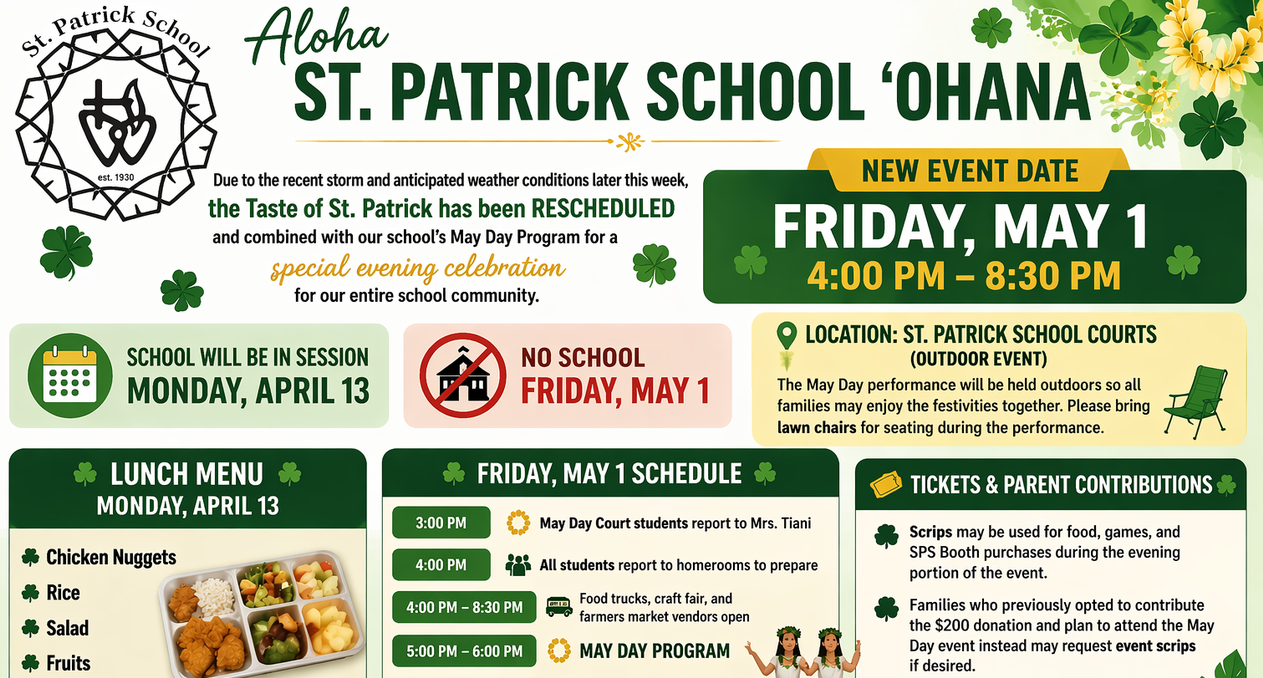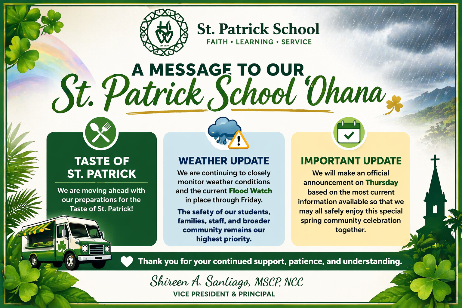 St. Patrick School promotes partnerships with parents and the extended family, with the Saint Patrick Parish and with the wider local and world communities. These partnerships strengthen communication and opportunities for learners that extend beyond the classroom experience.