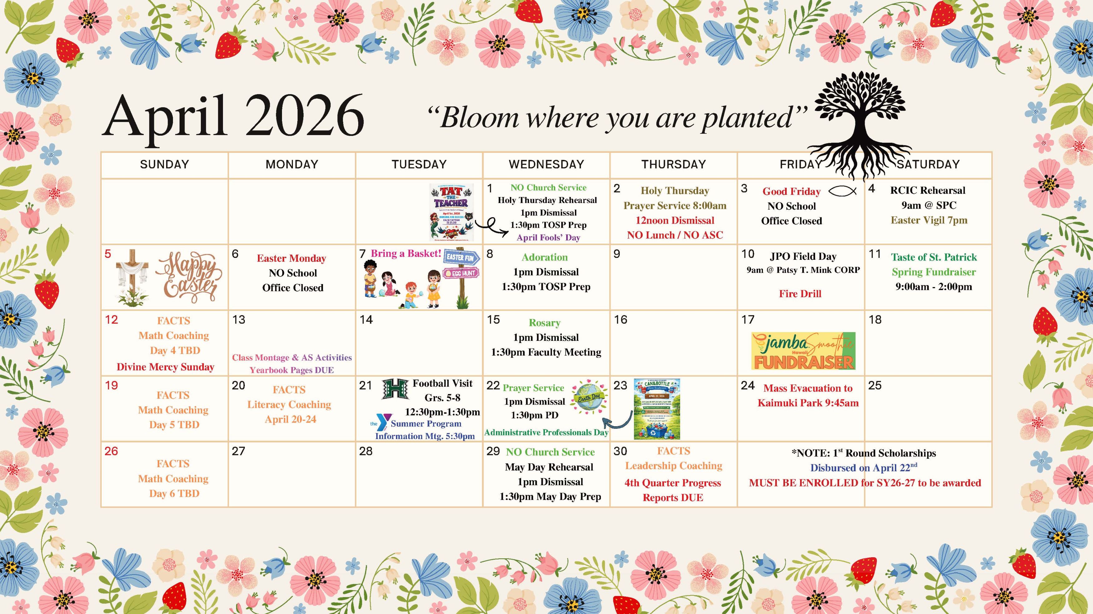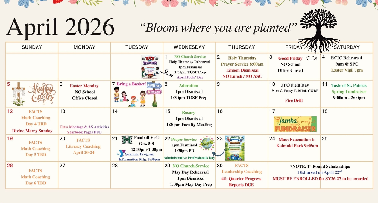 St. Patrick School encourages students to develop compassion and forgiveness by following the examples of Jesus and Mary. Additionally, the school promotes global betterment through teamwork and initiatives that support the common good.