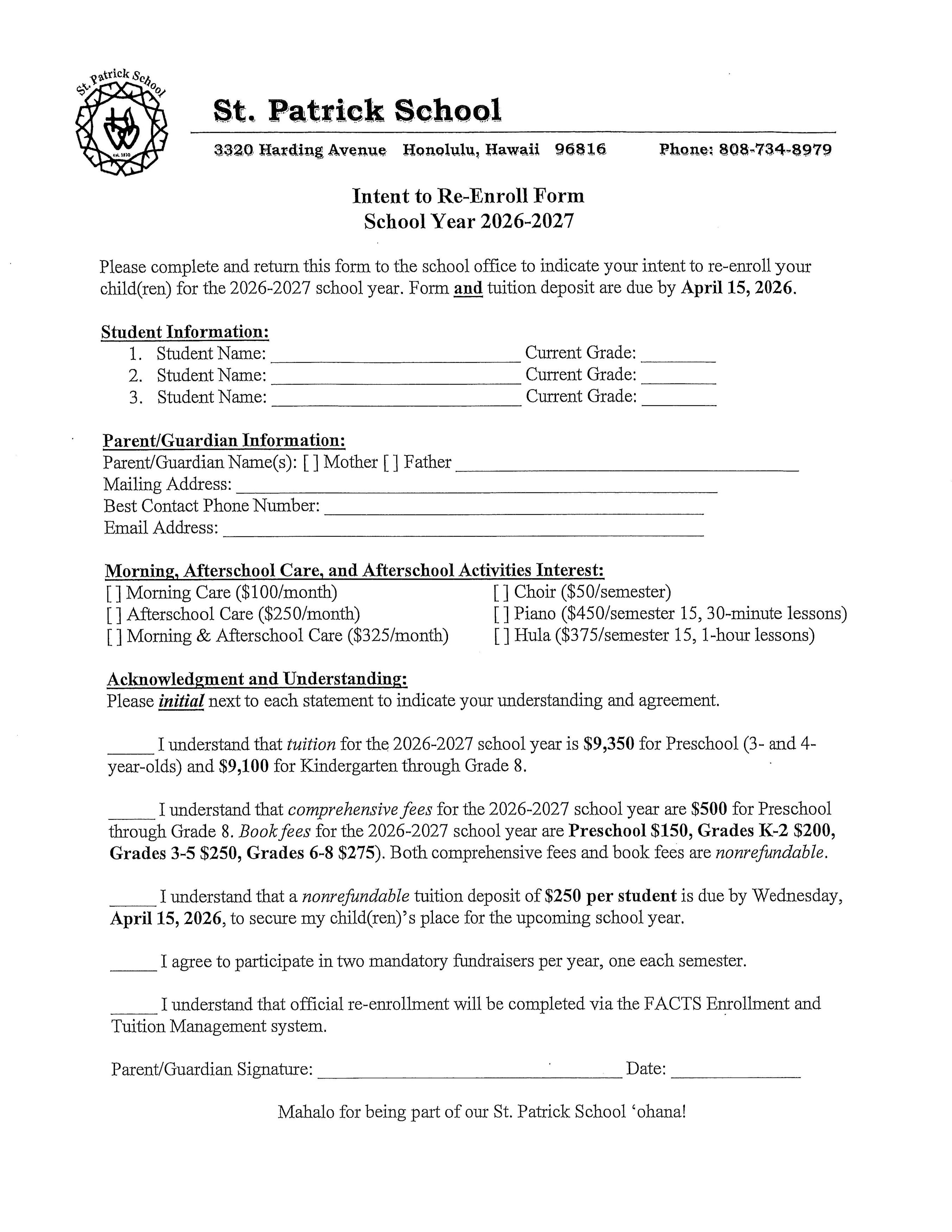 INTENT TO RETURN (Enrollment Form)